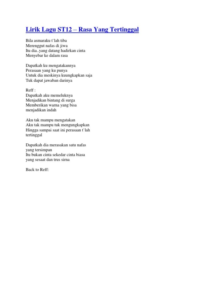 F g am bila asmaraku tlah tiba. F g am merenggut nafas dijiwa Itu dia yang datang hadirkan cinta. Bila asmaraku telah tiba merenggut nafas di jiwa itu dia yang datang hadirkan cinta menyeb. Itu dia, yang datang hadirkan cinta. verse 1 bila asmaraku telah tiba. Bila asmara ku tlah tiba. intro f g am 2x. Itu dia yang datang hadirkan cinta. English translation of lyrics for rasa yang tertinggal by st 12. Simak lirik chord rasa yang tertinggal dari st 12 berikut ini: intro f g am 2x. F g am bila asmaraku tlah tiba.
